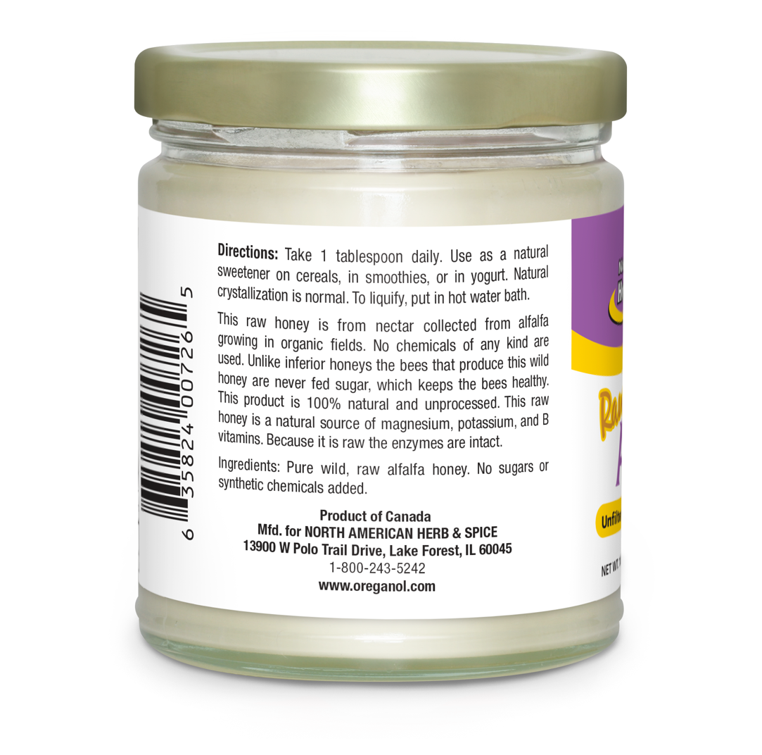 Raw honey is a natural source of magnesium, potassium, and B vitamins. Because it is raw the enzymes are intact. All honeys produced by NAHS are from bees never fed sugar, the only certified, whole food raw honey supplements available.
