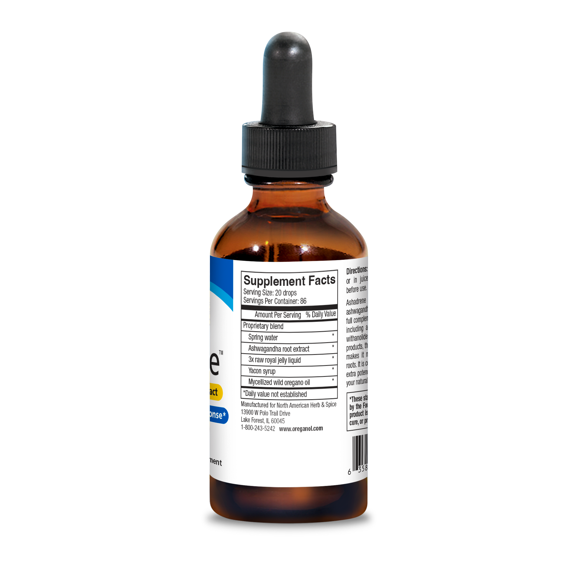 Certified Ashwagandha extract, Royal jelly, Spring water, yacon syrup, and Mycellized wild oregano oil