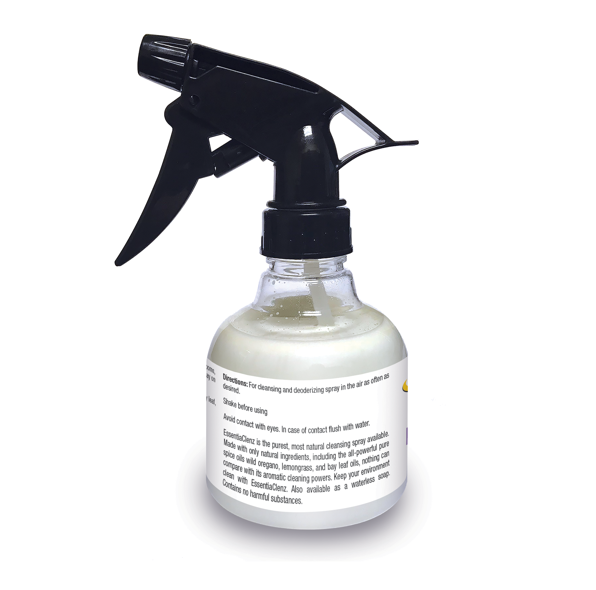 Enjoy cleanliness without chemicals. EssentiaClenz Cleansing Mist is the purest, most natural room spray available. Made with lemongrass oil. along with the all-powerful natural, potent oils of wild oregano, bay leaf, and black seed, nothing can match its air cleansing powers. The aroma is exotic, Use the spray to mist and deoderize air everywhere. Let the mist fall on all surfaces to cleanse. EssentiaClenz Cleaning Mist can be used on the body. hair, and in the shower. Free of all alcohol and solvents. Enjoy a new life with wonderful, aromatic EssentiaClenz Cleansing Mon allist.