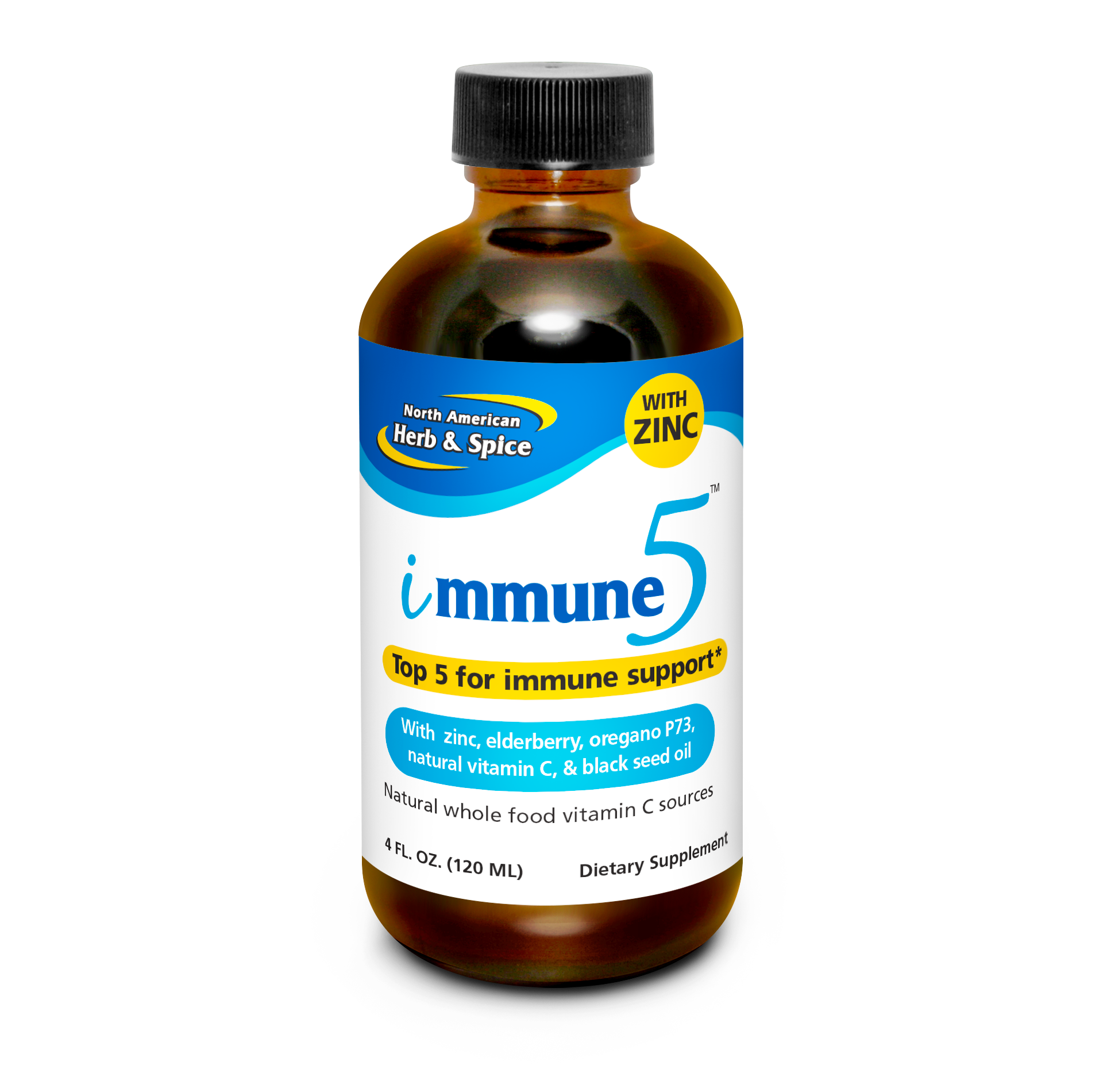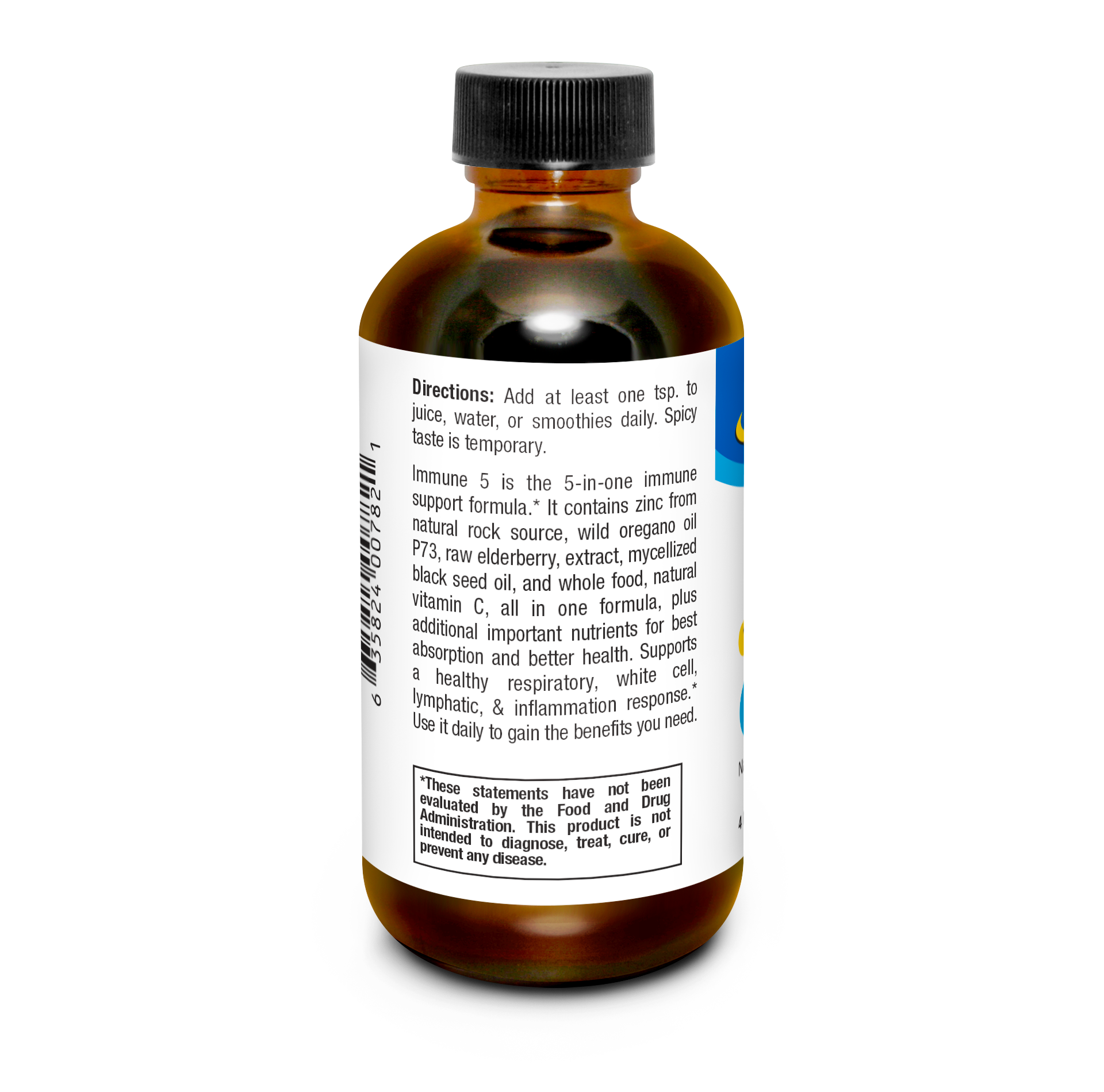 Top 5 Immune Strengtheners in a Single Formula with Naturally-Sourced Zinc. Immune 5 is the power of liquid rock source zinc, whole food vitamin C, raw organic elderberry, wild oregano P73, and natively sourced cold pressed black seed oil. Each individual ingredient has its own set of immune supporting attributes which are well established in the natural supplement industry and by science. Even so, no one has ever thought to put these high-quality components together and combine their powers for the best results… until now.