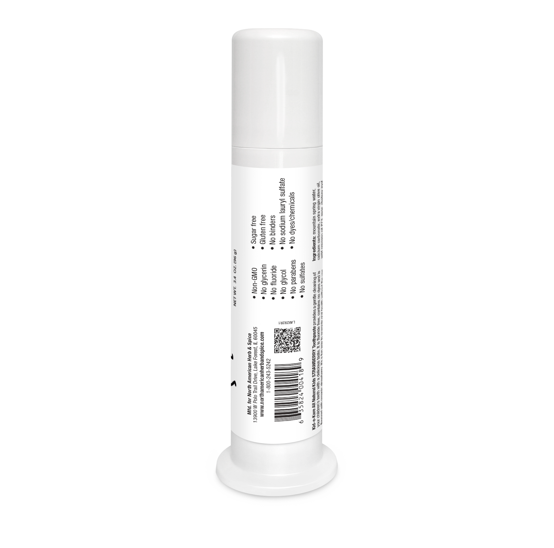 Ingredients: mountain spring water, calcium carbonate, extra virgin olive oil, wild oregano oil P73, sage, rhatany root, geranium, clove bud oil, birch tree extract, eucalyptus leaf oil, papaya extract, stevia, freeze-dried organic strawberry powder, organic strawberry flavor.