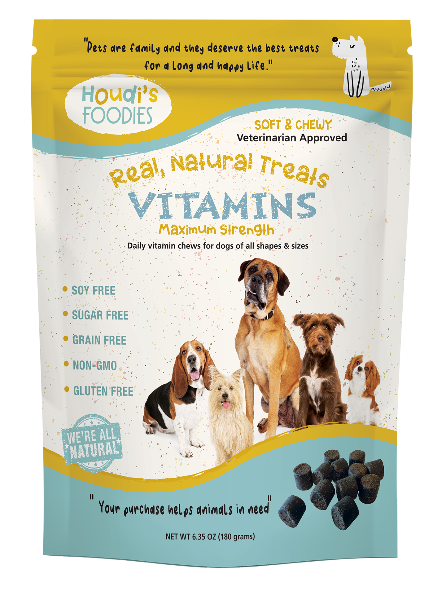 Real, natural, vitamin soft chews for dogs of all shapes and sizes When it comes to taking your vitamins, it’s just as important to give your dog a healthy boost as well. Vitamins can not only help maintain your family’s balanced health—they can help our four-legged, furry friends. While food alone might not meet all your pup’s health requirements, the right vitamin supplements can help compensate for any deficiencies in your dog’s daily diet.   Houdi’s Foodies are real, natural soft chew vitamin treats that help dogs stay healthy, happy, and active. Everything about our natural supplements is good for your pet, good for you, and good for a long and happy life together! And every purchase you make helps animals in need. Do a good deed for your furry friend with the healthy goodness of Houdi’s Foodies.